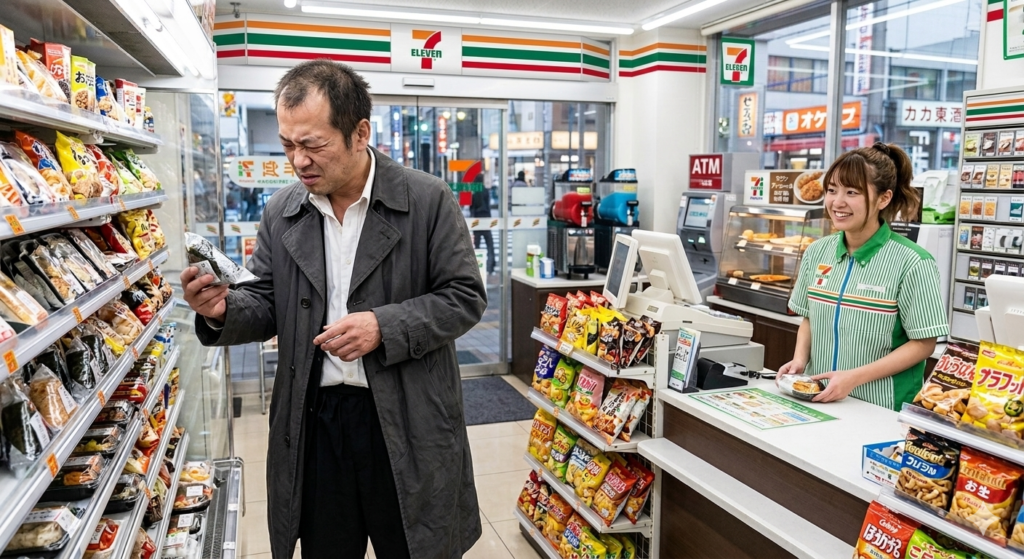 背後から、自動ドアがスッと開く。また一人、このいかがわしい光の箱に吸い込まれてくる奴がいる。そいつは、おれと同じように、ぼんやりと棚の商品を見つめている。彼の顔には、疲労と、諦めと、ほんの少しの飢餓(きが)が張り付いている。餓えているのだ。肉体も、精神も。この社会に生きる者は、皆、どこかしら餓えている。そして、その餓えを、この光の箱の中の、まがい物の食い物で満たそうと、無意識のうちにしているのだ。何たる悲劇。何たる喜劇。