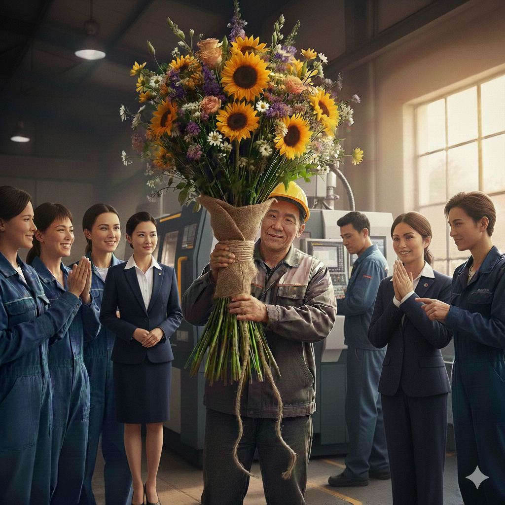 ただし、そこで購入する花は単なる花束ではありません。美しく装飾された大きなブーケで、価格にして4,000〜5,000円相当のものです。高さも60〜70センチほどあり、持ち運ぶには少々照れくささを感じるほどの存在感があります。そのブーケを手にして工場に入ると、女性社員たちの視線が一斉に集まり、嬉しさと恥ずかしさが入り混じった不思議な感覚に包まれます。